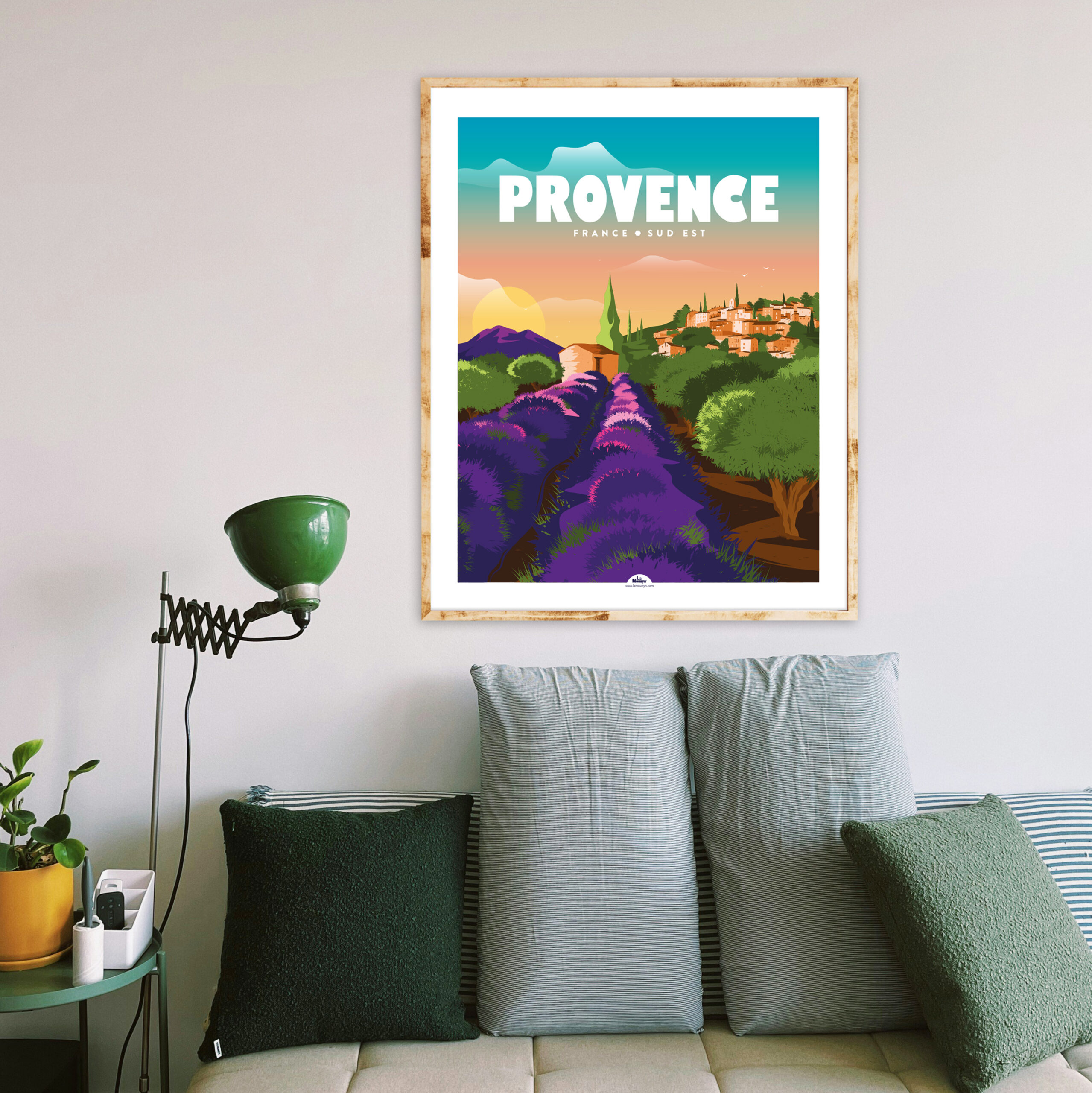 Champs de lavande & d’oliviers, ravissant village perché, somptueux massif, ciel bleu, douceur de vivre… Combo parfait qui représente notre belle Provence ! Tout y est, y a plus qu’à se laisser happer par cette jolie illustration qui appelle à l’évasion.